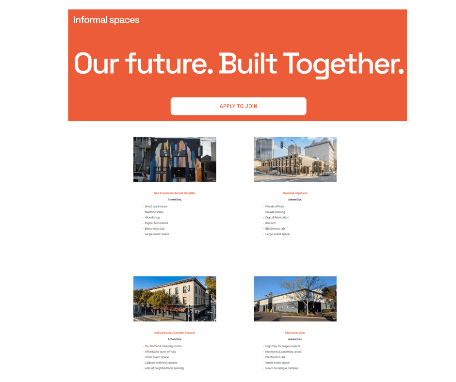 Throughout 2026, we’ll be partnering with other locations throughout the Bay Area and nationally to bring them into the network and build stronger connective tissue between the very spaces that make the hardware ecosystem tick. If you run a hardware-friendly coworking space or a makerspace that wants to pivot to supporting hardware professionals and teams, we’d love to hear from you. Reach out to spaces@informal.com.
