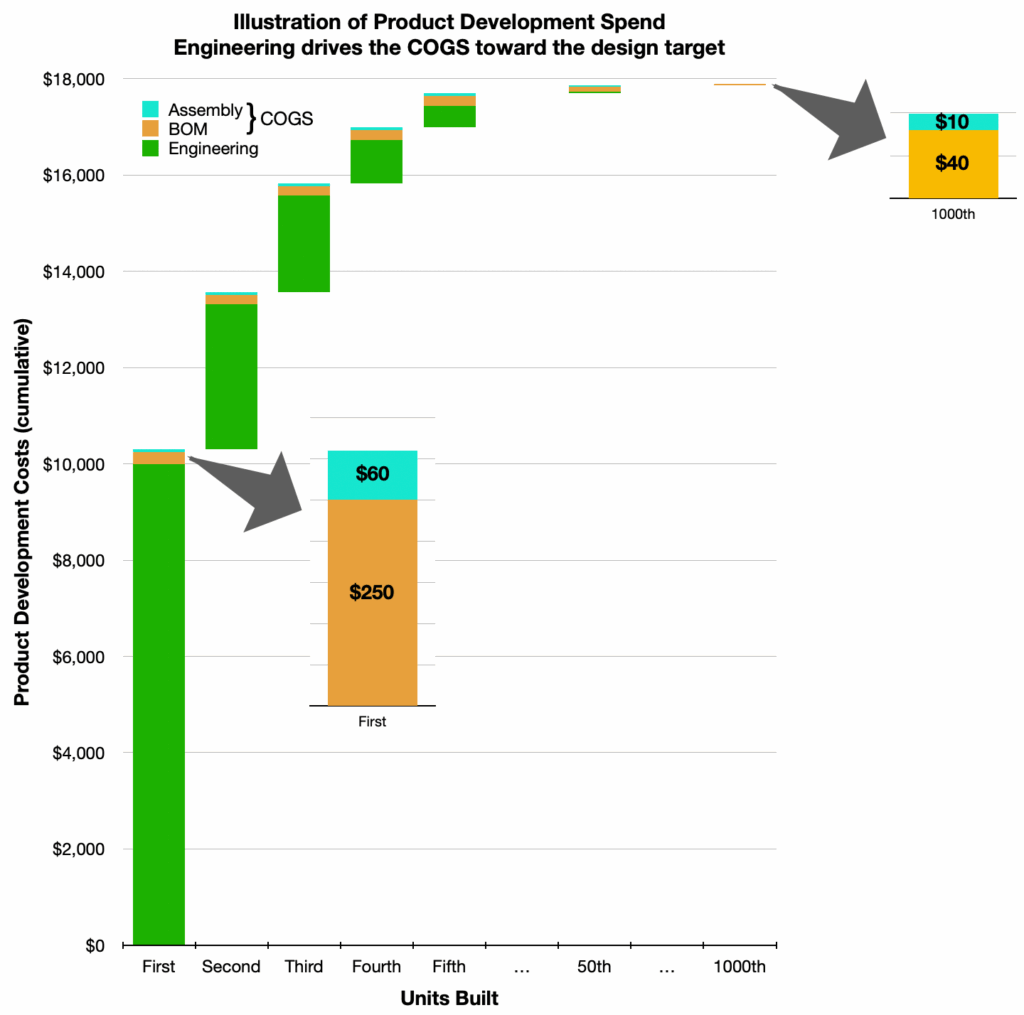 Notice how the bulk of the engineering spend comes before the first unit is built. As subsequent units are built, the engineering labour required starts to ramp down and the product manufacturing process is refined. The two callouts highlight how the COGS (assembly plus BOM cost) starts high and approaches the target. Even though the COGS remains high for early units, it’s still typically dwarfed by the engineering costs.