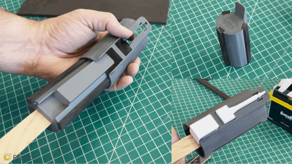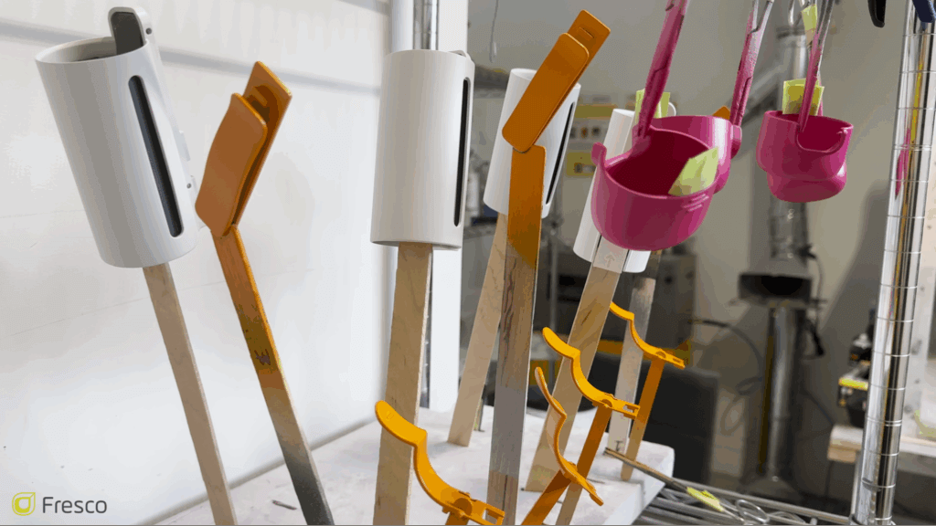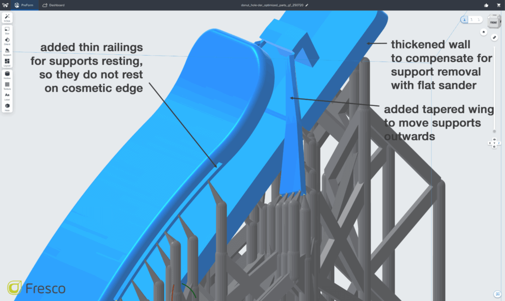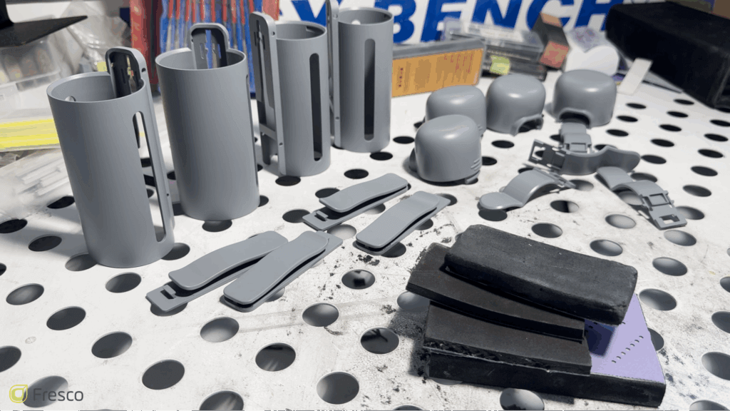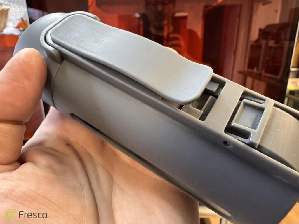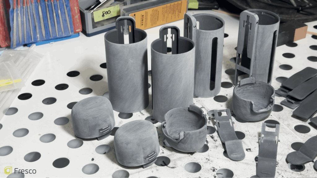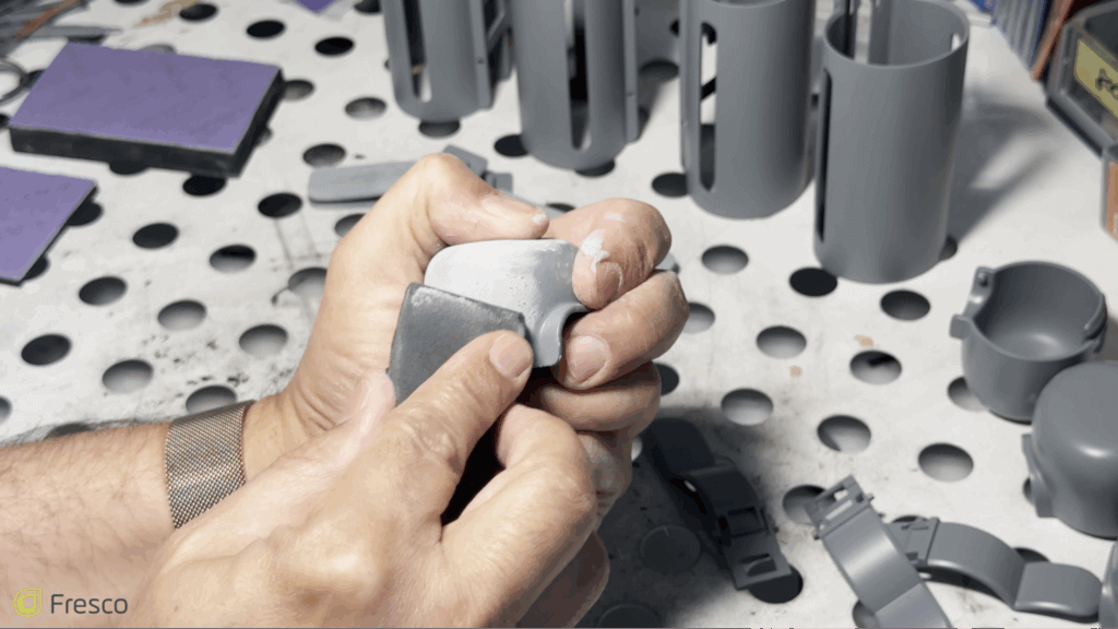 Gustavo from Fresco Design explained that his process starts by 3D-printing each part on a Formlabs 4 SLA 3D printer. SLA prints are known for their incredibly high resolution, and recent materials have allowed strong and functional parts to be made using this technology. He meticulously orients each part to ensure the supporting material added won’t cause any imperfections on the final unit. To do this, he may add additional structures to the 3D model, including adding protrusions to the parts that get cut away or sanded later.
