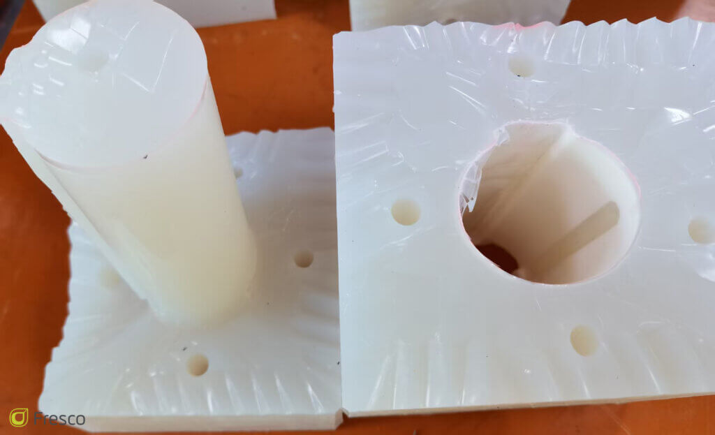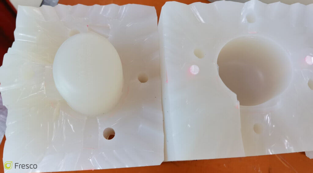 Urethane casting works by creating a perfect replica of the part to be cast. Typically, an SLA 3D print or CNC-machined plastic golden sample is created. This sample has special texture paint applied to it to replicate the desired surface finish of the final part. This piece is then encased in silicone rubber all around it, with strategic support structures added during the process to keep it in position.