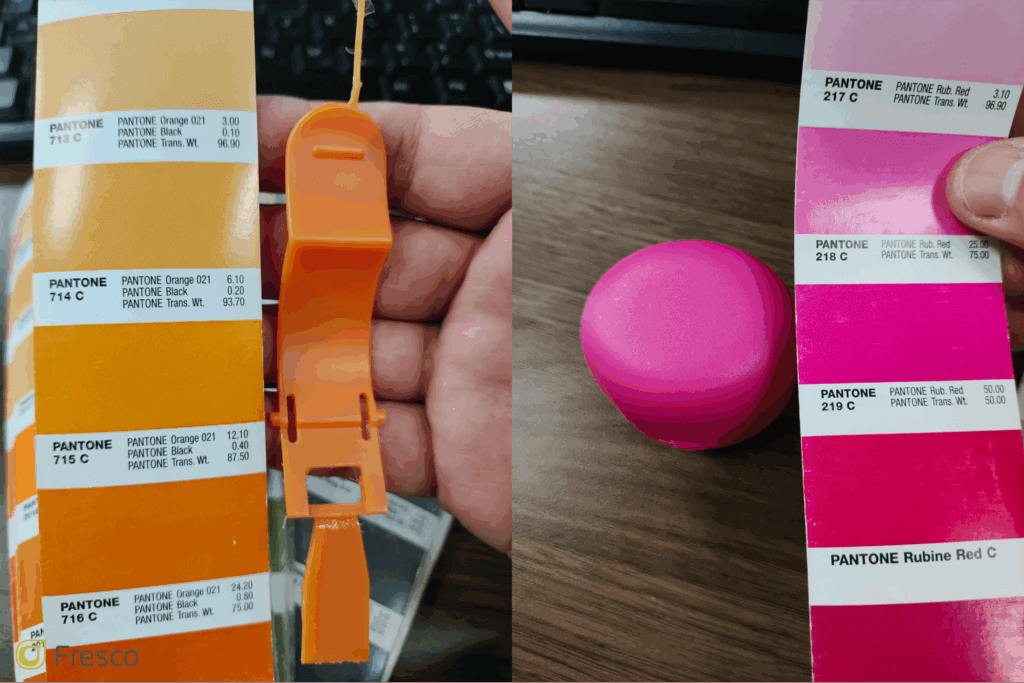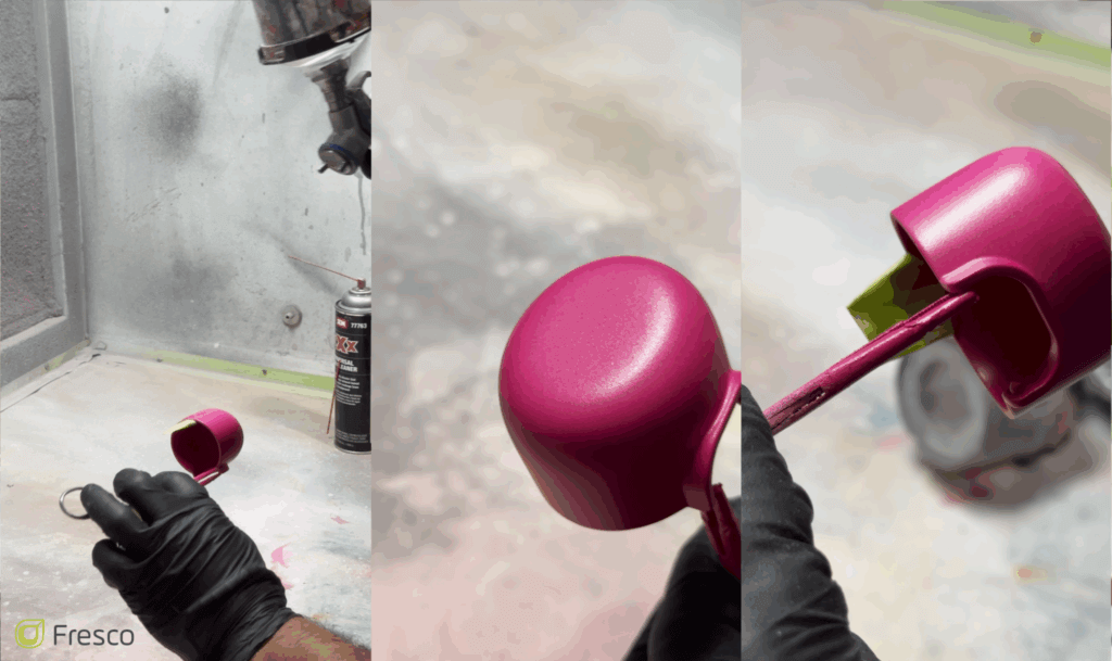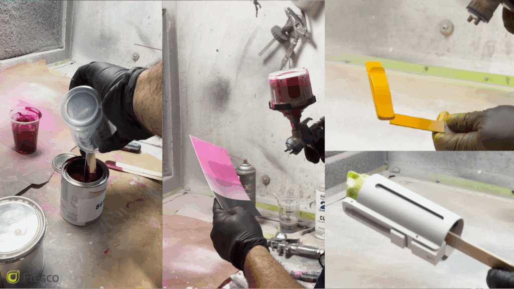 Next, we move to the spray booth. The team carefully mixes paint to match the target Pantone color. They order samples from Pantone and spray their mixed paint directly onto the swatch until it perfectly matches. Then, they carefully paint each part the correct colors. The 3D-printed fixtures help hold the parts up during painting and ensure any areas that shouldn’t get painted, like hinge pins or holes, stay bare.