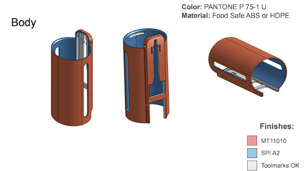 Notice how I use colored faces in CAD to call out where various finishes and textures should be on the part. MT11010 is a light matte texture, and SPI A2 is a highly polished glossy surface. You can mix and match to your heart’s content, and there are some really wacky options available.
